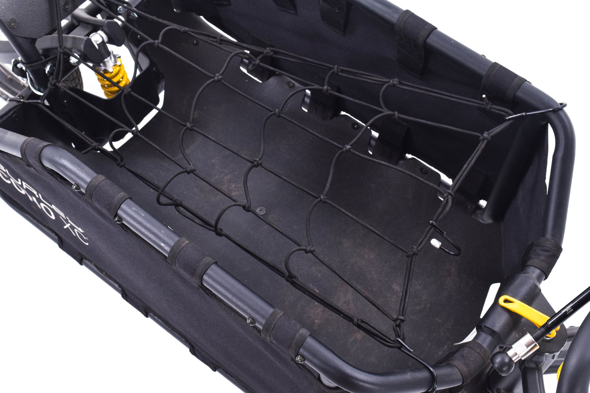 CONDITION: Used and in good shape. Minor scuffs to surfaces. Some dirt debris in cargo bed. Normally sold without an axle, this item does have one included. Burley's website offer's a guide on matching your bike's axle.